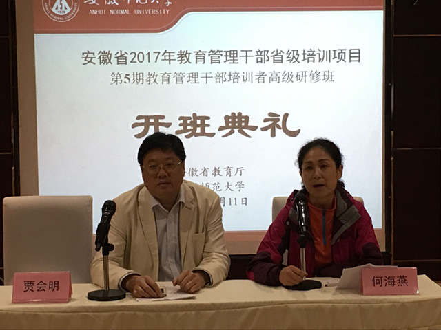贾会明副院长首先简要介绍了安徽师范大学的办学历史、雄厚的办学实力,安徽师范大学的担当与情怀,以及在服务地方基础教育方面所取得的显著成绩等。其次,针对本次培训班,贾会明提出了三点要求:希望各位学员要严格执行培训制度,集中精力、排除干扰,端正学习态度、珍惜学习机会;要正确处理好主线、底线、红线和辅线的关系;要联系实际、学以致用,努力提高管理能力,成为一名懂教育、专业化的学校领导。教育科学学院何海燕副院长主持了开班典礼,介绍了教育科学学院的基本概况,师资力量与专业设置以及培训团队的成员构成等相关情况,同时要求全体学员严格要求自己,配合好教学过程的各项管理,确保培训项目顺利推进,圆满完成。