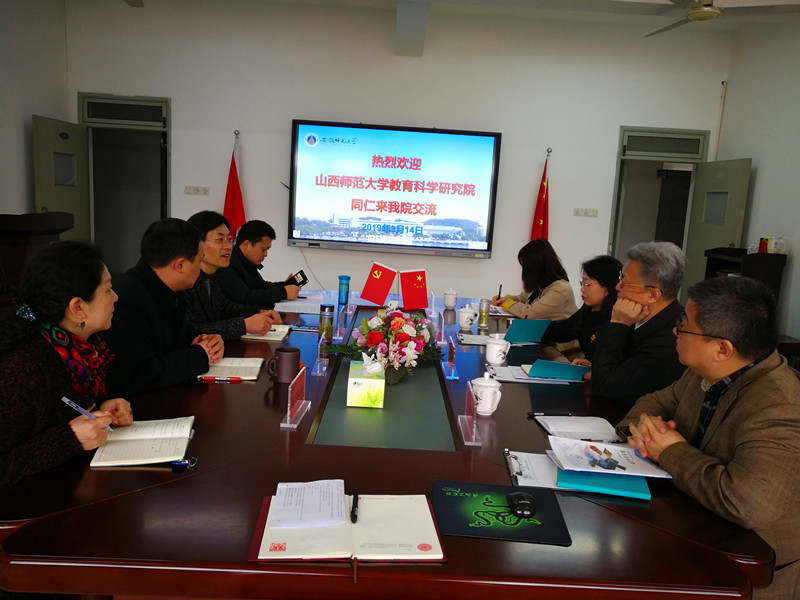 本网讯 (教科院 孟庆娟 李梦悦)2019年3月14日上午,山西师范大学教育科学研究院院长杨晓、党委书记王承吉、领军人才朱晓民及秘书赵晓宁一行莅临我院学习交流。院长桑青松,副院长聂竹明、辛治洋、何海燕参会并做交流。
