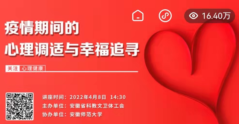 本次线上心理健康讲座活动的顺利开展,体现了省教科文卫体工会对广大职工和学生群体的人文关怀,展示了安徽师范大学心理学科团队回应社会需求的责任担当,取得了良好的传播效果和社会反响。据悉,讲座将以视频回放的形式持续向公众开发。