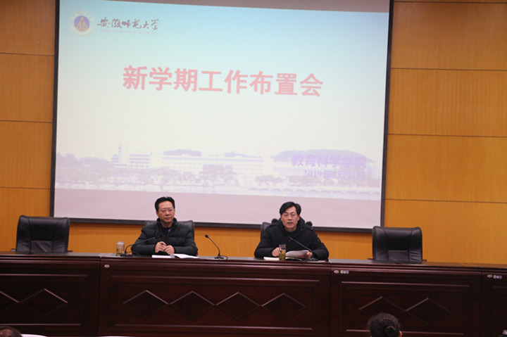 本网讯 教科院 卞纲要/文 莫大贡/图新春伊始,万象更新。2月21日下午,教育科学学院在赭山校区田楼报告厅召开全院教职工大会,院长桑青松教授向全体教职工通报了寒假期间学院的各项工作开展情况,并对2019年学院重点要开展的工作进行布置,会议由学院党委书记方泓主持。