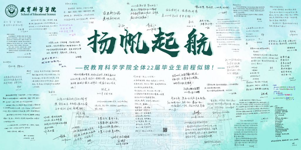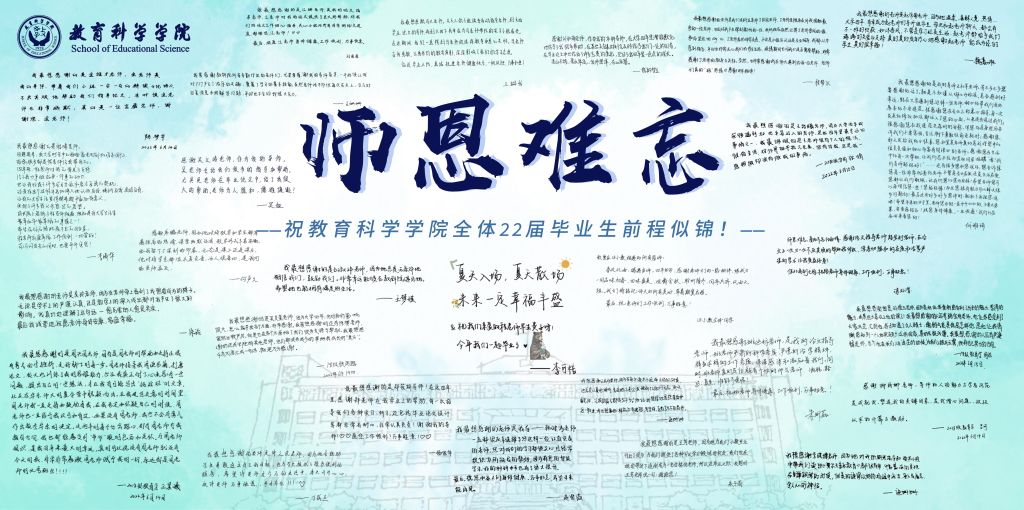 四载时光飞逝过,一朝欢聚话真情。教育科学学院2022届本科毕业生将带着母校的期盼和祝福,牢记“师大人”的身份,秉承“厚德 重教 博学 笃行”的校训,“学思并重 知行合一”的院训,怀着梦想和抱负,从这里踏上新的征程,跃入人海,各自灿烂。