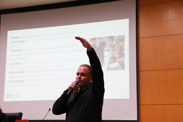 报告中,主讲人Disney介绍了自己同中国的深切渊源,并向全场表达了自己对中国这片热土的敬仰和热爱。谈及自己从事早教工作的多年感受,Disney对在座的多位学前教育从教人员和研究人员致以崇高的敬意。Disney的恳切言谈中向在场听众传达了“学前教育工作的重要性和挑战性”认识;接着Disney更是热情地向大家介绍了本人从教的学校——莫纳什大学 ,从校区的分布到各色皮肤的学生,从多项举例和多处设疑,无不流露出Disney对其工作与生活的积极乐观态度。在对比中国的早教教育时,Disney向大家介绍了澳大利亚的两条统一性教学大纲,分别是0-5岁的早期儿童教育大纲、小学至高中的12年教育大纲。这表明了“早教教育”在澳大利亚国民教育中所占到的重要位置。关于教学评估和电子技术使用,Disney就评估在教学中所起的作用详细说明并展示了澳大利亚现有的评估模式“一对一测试”。同时强调了儿童的学习通过“特定的儿童书籍”来提高认知水平,达到应有的发展阶段这一教学方式的合理性。针对现行教学中电子技术的使用问题,Disney现场采访了两位中国的早教从教人员,对比澳大利亚的教学较少涉及电子技术的应用现状,更是以他本人的博士论文向大家展示电子技术在教学中应用与否的变量结果。在早教中的数学学习部分,Disney分别以 Developing number sense subitisingbase 10 Hands-on learning 四方面运用现实举例及现场互动,生动趣味的向大家揭示了数学学习的关键所在。