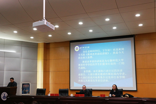 会议伊始,主持人徐赟副教授怀有饱满的热情以流利的英文隆重介绍了主讲人Leigh Disney(迪斯尼 ·李)的学术履历,同时表达了对Leigh Disney(迪斯尼 ·李)及其爱人耿华副教授安徽师范大学一行的欢迎和期待。