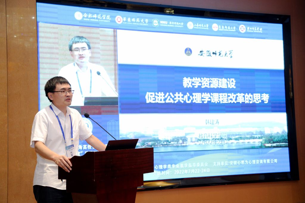本网讯(教科院 彭苏浩)2022年7月23至24日,由合肥师范学院主办的“长三角高校公共心理学课程虚拟教研室”建设工作研讨会在合肥召开,本次研讨会以长三角一体化背景下的高校公共心理学课程虚拟教研室建设为主题。来自华东师范大学、浙江大学、南京师范大学等高校的专家学者、师生代表100余人参加了会议。教育科学学院桑青松、韩建涛等教师受邀参会。