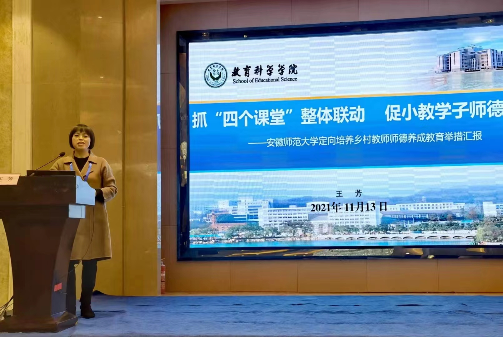 王芳1995年留校任教至今,数十年如一日。她非常珍惜这个专任教师岗位,潜心教学与科研工作,曾担任安徽省明德小学品牌建设工程项目和乡村首席教师研修项目首席专家,公开发表学术论文多篇,参编教材和著作多部,主持安徽师范大学教材建设基金项目、安徽省哲学社会科学规划项目、安徽省教育厅人文社科项目、安徽省高校优秀青年教师基金项目、教育部委托民办教育相关课题等多项研究。她曾在母亲生病期间坚持完成明德小学品牌建设项目的下校跟踪指导,最终没能和母亲见最后一面,至今仍是她的一大遗憾,在孩子就读高中的关键节点接任小学教育专业负责人,陪爱人生病住院期间念念不忘各项工作。这些在她看来都是缘于对教育工作的热爱和责任。