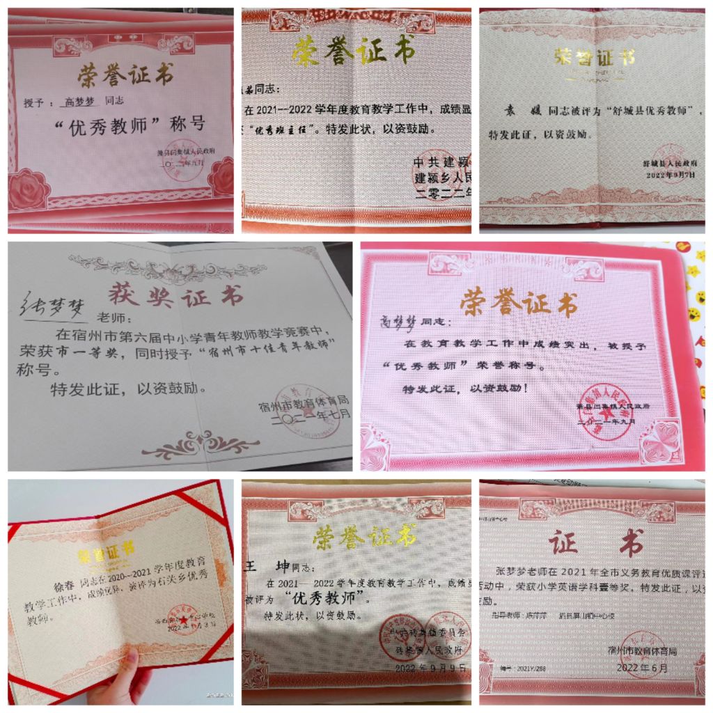 毕业生在岗工作尽职尽责,表现突出,受到表彰和嘉奖。据不完全统计,2020、2021届毕业生在工作两年来共获得各类先进个人奖项近40人次。其中, 2020届张梦梦被评为“宿州市十佳青年教师”“宿州市优质课一等奖”“泗县大杨镇最美志愿者”“泗县屏山镇优秀教师”、“屏山镇中心学校优秀党员”;高梦梦两次被评为萧县闫集镇“优秀教师”,王坤被评为界首市专集镇“优秀教师”,徐春被评为岳西县石关乡“优秀教师”;2021届袁媛被评为“舒城县优秀教师”,邵雅茹被评为颍上县建颖乡“优秀班主任”……这些成绩的取得,都离不开在校期间的培养和指导。