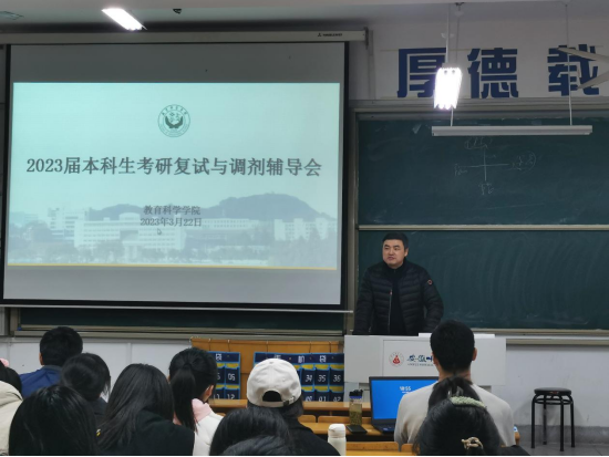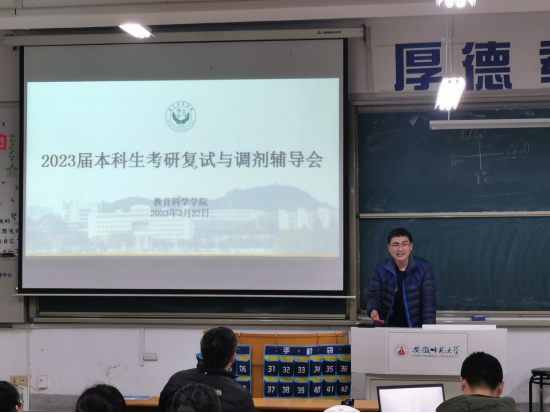 为提高2023届本科生考研复试能力,提升调剂成功率,3月22日晚,教育科学学院于田楼8202教室召开考研复试与调剂辅导会。院长李宜江,副院长韩建涛、吴文涛,教育技术学专业负责人肖文及2019级本科生辅导员莫大贡、濮楠楠出席会议,会议由莫大贡主持。