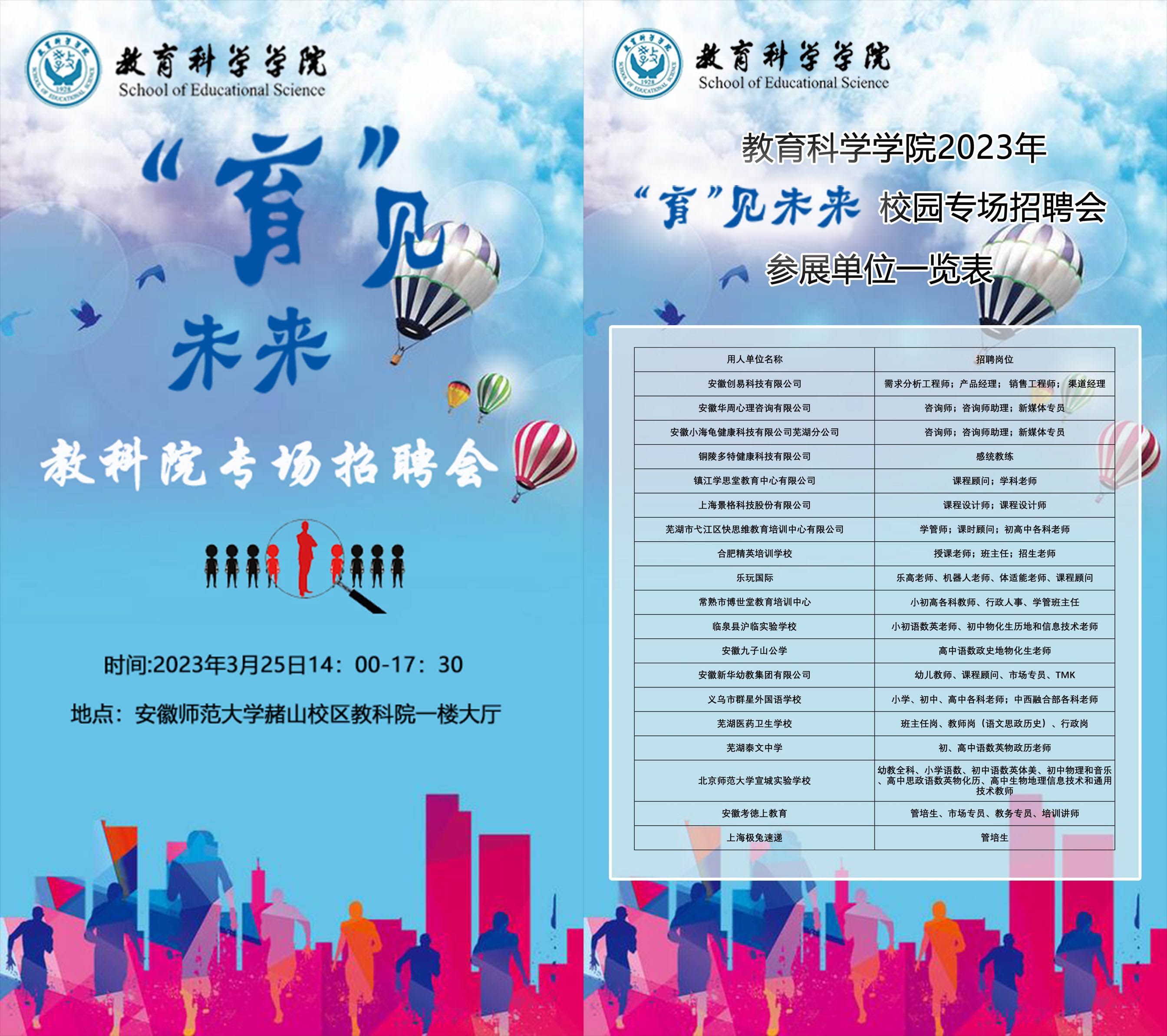 为全力做好2023届毕业生就业工作,积极构建毕业生与用人单位沟通平台,教科院经过前期联系筛选,积极对接各家用人单位,详细梳理了用人单位的具体名单、岗位需求等信息。此外,教科院线上搭建信息速递平台,让毕业生第一时间知晓招聘信息,第一时间准备个人简历,第一时间参与招聘活动,并鼓励在校学生提前来了解未来就业情况。