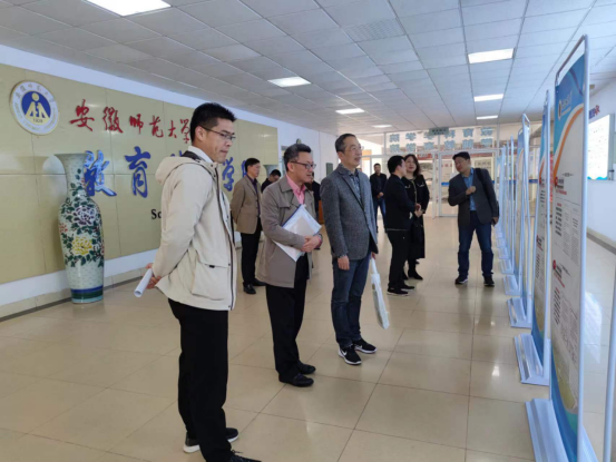 上午10点30分,在校党委常委、副校长熊宇杰的陪同下,由省教育厅第四评估专家组组长张严政、安徽工程大学国际交流合作处副处长朱铁军、安徽农业大学国际交流合作处副处长张文静、合肥市教育局基教处副处长徐超组成的评估专家组一行首先参观了我校中美合作现代教育技术专业硕士研究生教育项目自评估成果展,成果展包含本项目办学特色、历史与贡献、人才培养成效等方向的介绍。