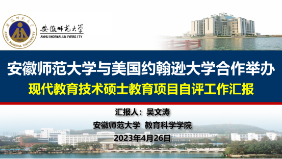 上午11时,我校与美国约翰逊大学合作举办的现代教育技术专业硕士研究生教育项目评估汇报会在我院408会议室举行,省教育厅评估专家组一行,我校党委常委、副校长熊宇杰、国际交流合作处处长张德让、研究生院院长桑青松、财务处处长王爱民、审计处副处长周玉柱、网信办副主任聂竹明、国际交流合作处副处长杜俊、葛亚东以及我院领导班子成员与项目导师代表共同参加了汇报会,会议由专家组组长张严政主持。