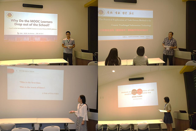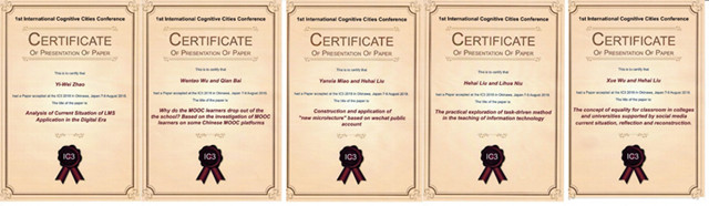 与此同时,本次参会的师生也提交了研究论文,并分别参与各分会场的汇报与交流。刘和海老师以“The practical exporation of task-diven method in the teching of  information technology”为题,论述了任务驱动教学法在中学信息技术学科中的应用案例研究;吴文涛老师以“Why do the MOOC leaners drop out of the school? Based on the investigation of MOOC leaners on some Chinese MOOC platforms”为题,汇报了慕课学习者退课的原因、现状调查与策略分析等;吴雪同学以“The concept of equality for classroom in colleges and universities supported by social media: current situation, reflection and reconstruction为题对当下社交媒体进课堂的现状进行调查以及反思,从而构建一种社交媒体支持下的平等课堂; 赵一唯同学以“Analysis of Current Situation of LMS Application in the Digital Era为题,介绍了LMS应用的现状以及策略分析;此外,吴雪同学代苗艳侠同学汇报了“Construction and application of "new microlecture" based on wechat public account”论文。