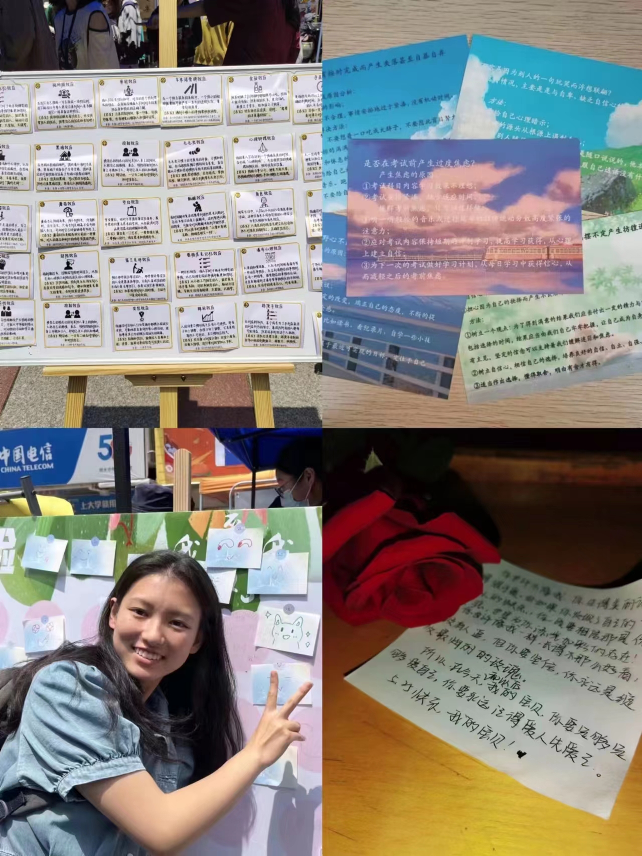 各专业各班级结合自身专业学习与生活实际开展各有特色心理健康主题班会,通过主题班会传播心理健康知识,以多种方式传授心理调适小技巧,在班会中发挥朋辈辅导的心理健康作用,引导广大学生不断提升心理健康水平,增强心理健康知识。5月25日当天,学院于赭山校区食堂广场前开展5·25专场系列活动,在心理知识科普展活动中共设置了58个心理学知识点张贴在展板上,每位同学可以撕取感兴趣的心理学知识点,有效的进行了心理健康知识科普。为了让同学学会自我关怀,能够解决当下心理困境,学院组织了“夏日信笺”自我关怀活动,将调研得来同学们常关心的问题以便签的形式张贴在展板上,每位同学可根据自己的困惑领取对应的明信片,明信片上描述了具体的解决方法,让同学更加聚焦当下问题的解决,舒缓当下心理困惑,有效增强了心理健康水平。微笑是具有多重意义的语言,微笑是放松心情的法宝,是解决问题的武器,教科院开展“寻找最美微笑,留下你的笑脸”活动,用笔勾勒出自己最美的微笑,让每位同学在活动中感受微笑的力量,成为经常微笑的人。