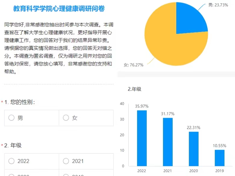 为了解学生心理健康素养、生命价值观、人际交往等常见心理困惑,学院开展专题心理健康调研活动,发放《教育科学学院心理健康调研问卷》,回收有效问卷1479份,重点考察学院本科生心理健康状况与心理健康教育工作评估,调研内容主要包含大学生心理健康水平评估、学校心理健康教育工作评估、大学生对心理咨询的认识、心理困惑的疏解、大学生入学前后心理健康水平的变化以及对于心理健康教育的建议。针对相应问题进行原因分析与有效解决,提升了心理健康教育工作的温度与深度。