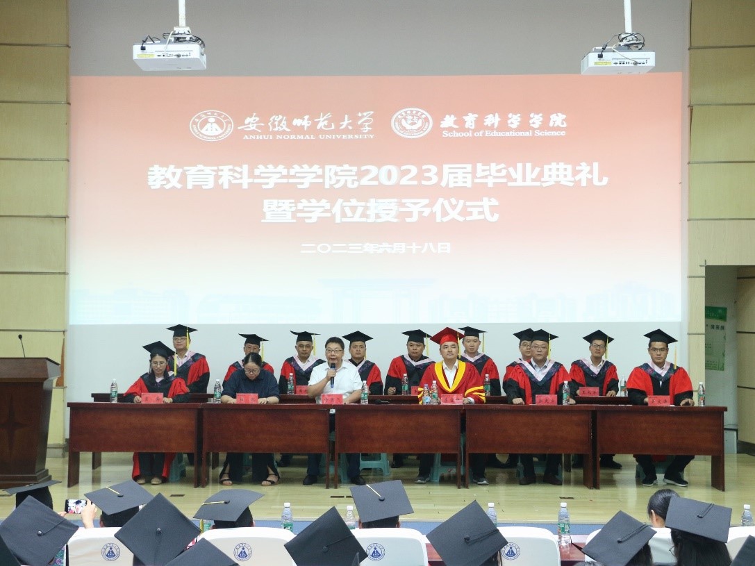毕业典礼,共期未来。6月18日下午,学院于赭山校区科技小礼堂举行2023届毕业典礼暨学位授予仪式。全体院领导、院学术分委员会全体老师、院学位分委员会全体老师、各学位点点长、各专业负责人、教师代表和全体毕业班辅导员与全体2023届毕业生欢聚一堂,共同见证令人难忘的时刻。李宜江院长赠言毕业生们要解放思想,实事求是、精益求精,追求卓越、宁静于内,行稳致远,无论毕业生们前往祖国的何地,教科院永远是各位毕业生的家,欢迎毕业生们常回家看看。