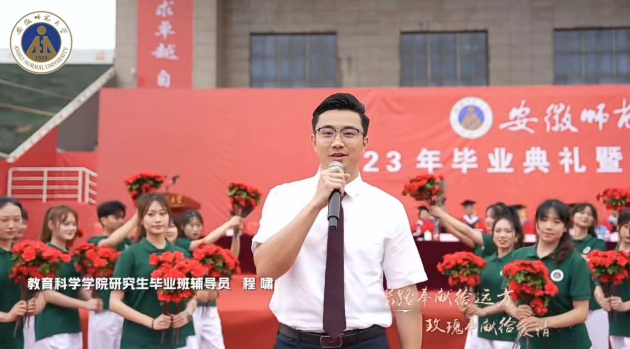 6月18日下午,教育科学学院于赭山校区科技小礼堂举行2023届毕业典礼暨学位授予仪式。学院领导、老师和全体毕业班辅导员出席本次典礼,与全体2023届研究生毕业生欢聚一堂。典礼由院党委书记许国飞主持,毕业典礼在庄严的国歌中拉开序幕,与会领导老师为毕业生颁发毕业证书并拨正流苏。6月20日,学校2023年毕业典礼暨学位授予仪式在花津校区北体育场隆重举行,院研究生毕业生辅导员程啸作为代表参与表演,祝愿毕业生不负年华,永葆珍贵的师大记忆,铭记浓浓的师生情怀。