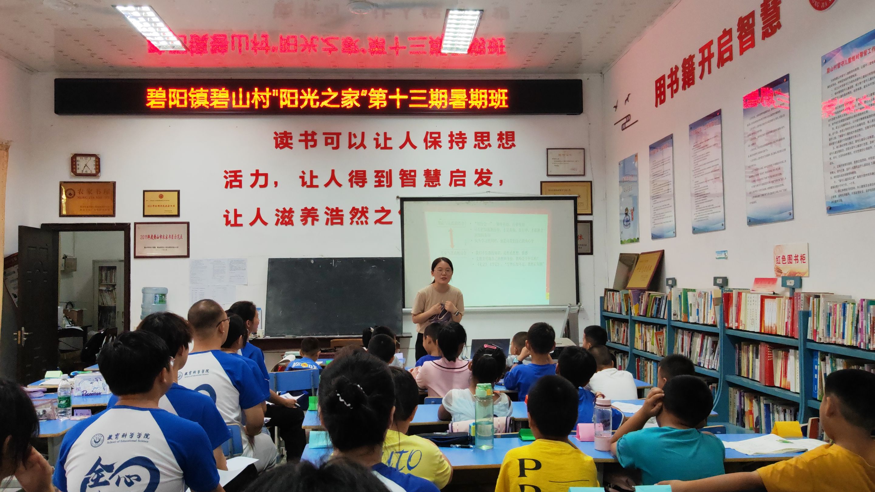 18日下午,杜凤一行分别来到黟县南屏村和碧山村阳光之家深入课堂观摩授课,并开展座谈交流,详细了解实践队员的工作和生活情况。碧阳镇关工委常务副主任胡建新,碧山村妇联主席查永红,“阳光之家”发起人之一欧阳金洪陪同慰问。在南屏村座谈中,队长杨爱娇提到,“今年的支教课堂极富挑战性,主要原因在于学生的年级跨度很大。针对这个问题,支教队员积极开设丰富多样的教学课程,不拘泥于传统教学方式,利用自身专业优势和多媒体资源创新、丰富教学形式,真正让课堂‘活起来’,确保每个学生都能学有所获。”杜凤表示,暑期社会实践是把专业知识与具体实践紧密结合的“行走的课堂”,勉励大家发扬吃苦耐劳和团队合作精神,不断在实践中磨炼意志、增长才干。