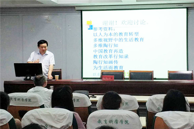 随后,储朝晖教授通过详细介绍陶行知先生止于人民幸福选择终身从教的教育志向、止于人民幸福创立的生活教育理论、止于人民幸福提倡民主教育这三个方面启发学生学习陶行知须从创造人民幸福做起紧接着储教授又分别从生活教育的发展阶段、形成因素内涵与逻辑哲学基础方面对陶行知先生的生活教育理论进行鞭辟入里的分析。使在座的同学们对陶行知先生的教育思想有了更深刻的领悟,受益匪浅。