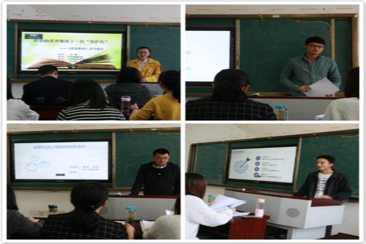 (教科院 文/倪健 图/胡旭珽)为积极响应我校《关于举办安徽师范大学第二届研究生读书报告比赛的通知》,结合学院发展需要,进一步激发我院研究生读书兴趣,提升专业素养和创新能力,推动教学研究型学院的建设。4月25日下午,由我院学研部组织的第二届“研究生读书报告比赛”在院412教室成功举办。本次比赛邀请到了我院王清、柳丽娜、薛红莉、王礼军四位老师担任专家评委,参赛选手以个人或团队为单位共分十组,学研部成员倪健担任主持,部分研究生到场观摩。