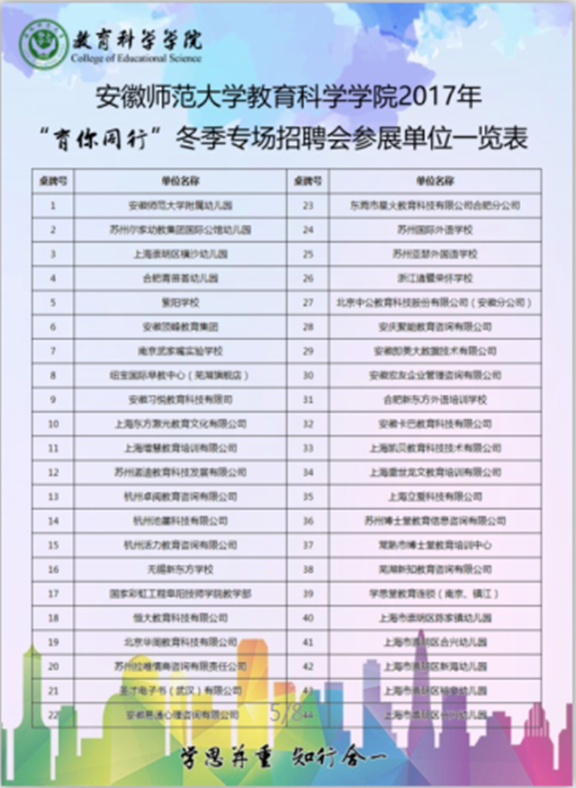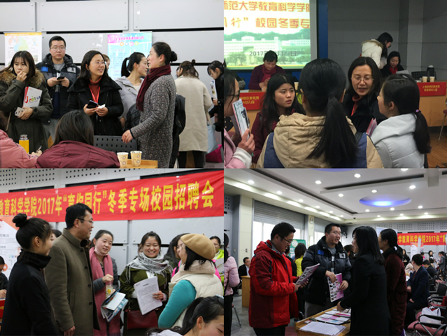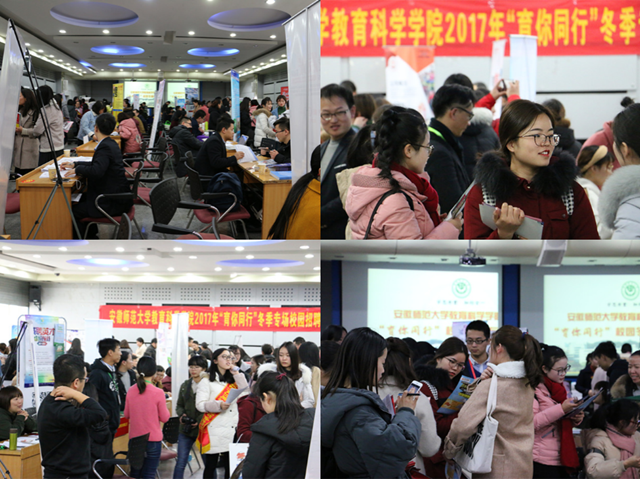本网讯(教科院 龚伟)把握就业黄金期,服务学子好时机。为全力做好2018届毕业生就业工作,搭建毕业生与用人单位交流“直通车”,12月27日下午教科院举行了学院第四届“育你同行”校园冬季专场招聘会。上海崇明区教育局、苏州尔家幼教集团、南京武家嘴实验学校、北京华图教育科技有限公司、中公教育、国家彩虹工程阜阳技师学院、安师大幼教集团等来自省内外的45家用人单位共提供就业岗位近500个,吸引了300多名毕业生前来求职应聘。