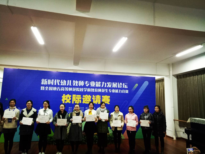 本网讯(教科院 许佳绿)为了适应新时代对幼儿教师职前培养的新挑战,更好地交流各校师范生培养经验,促进师范生教学能力的提升,培养一批具有高尚师德、先进教学理念、扎实教学技能的优秀幼儿教师后备力量,促进学前教育专业各层次人才培养质量的提高,我校首次于2017年12月8-10日受邀参加由首都师范大学、浙江师范大学、上海师范大学联合发起学前教育专业能力邀请赛。我院特派2015级学前教育专业许佳绿参加比赛,并获得二等奖的成绩(参赛选手共19人,按40%、60%分设一等奖、二等奖)