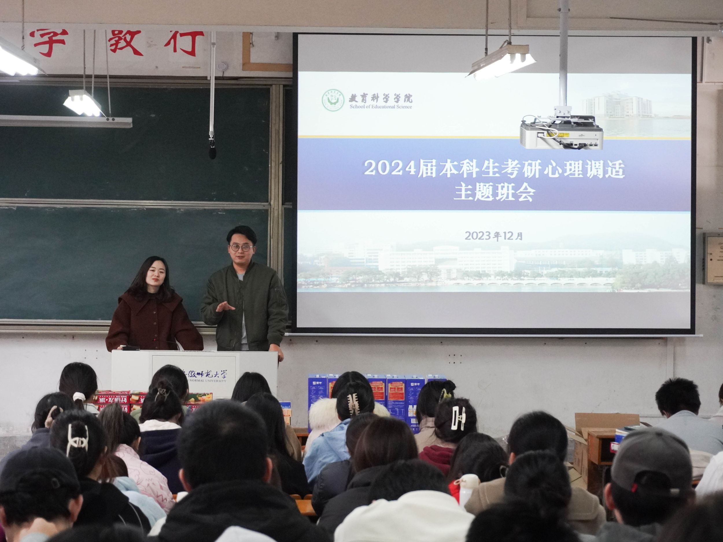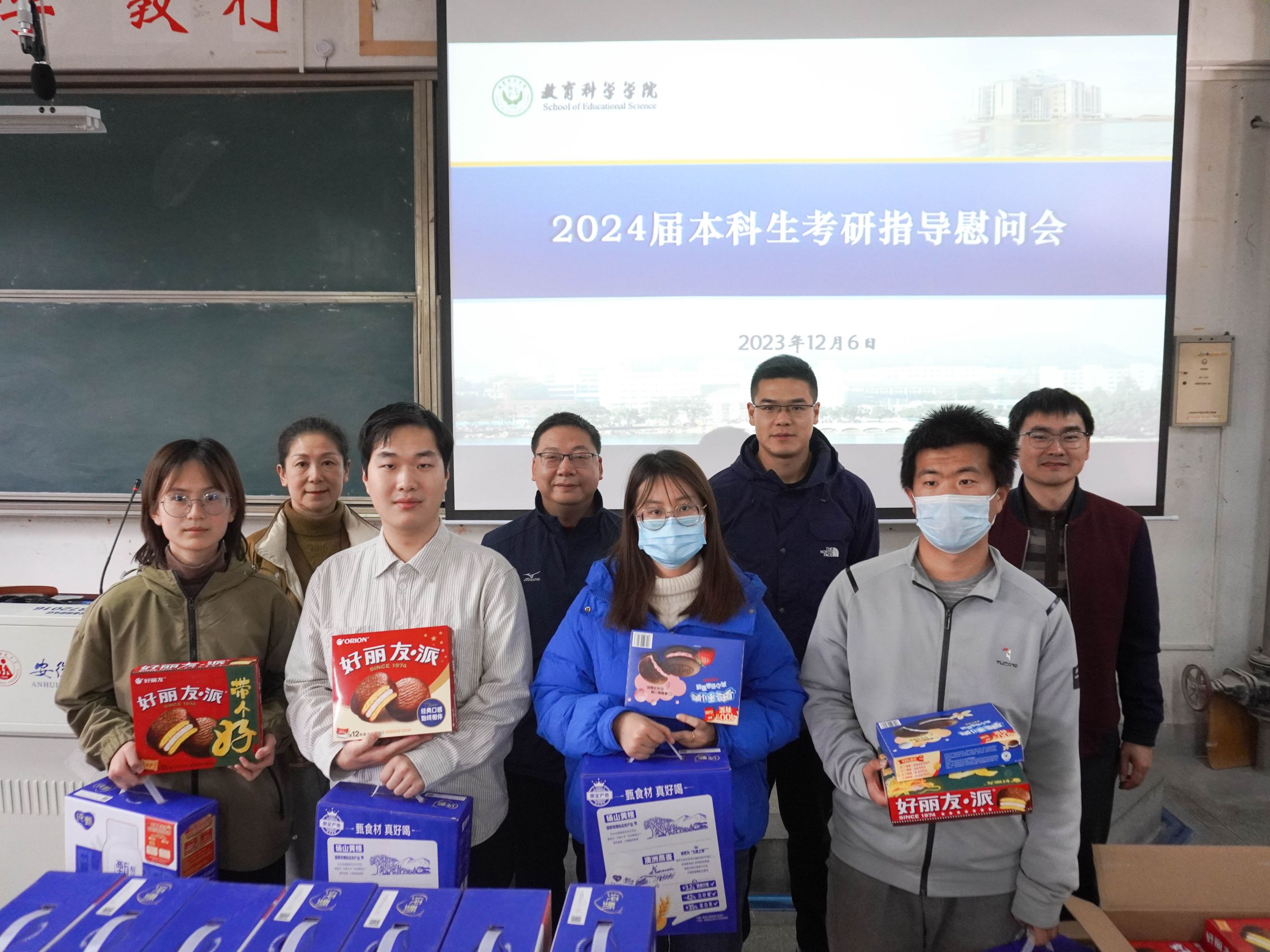 12月6日下午,教育科学学院在田楼8102教室召开了2024届本科生考研指导慰问会,为2024届考研学子们加油鼓劲,缓解备考压力。学院党委书记许国飞,副院长韩建涛、吴文涛、何海燕,毕业班辅导员蔡文、张理强,以及2024届全体考研学子参加,会议由蔡文主持。