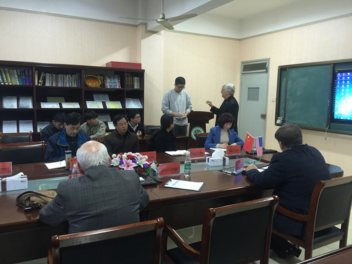 本网讯(教科院 马兴)12月4日,美国布莱诺大学校长Edward Schrader 、Peter Miller、Jim Eck一行来到教育科学学院就中美学前专业人才培养问题与学院师生进行了亲切交谈。交流会由学院院长桑青松主持,学院党委书记刘晓宇、副书记张如华、副院长何海燕、院长助理周元宽、学前教育专业教师赵学菊、及2016级、2017级全体中美学前专业学生参加了此次座谈会。