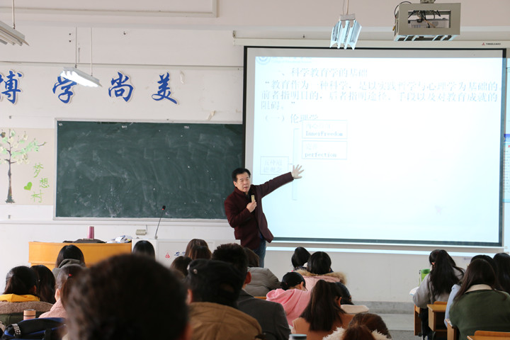 本次公开课的教学内容围绕赫尔巴特教育思想展开,姚老师首先带领学生回顾了十六世纪以来几位主要的外国教育家对教育学科的贡献,指出从培根首建教育学科到赫尔巴特之前,教育学学科建设并不能令人满意,印证了赫尔巴特教育思想的“里程碑”意义。接着姚老师从伦理学和心理学两个角度阐述了赫尔巴特作为“科学教育学之父”的主要理论贡献。讲解过程中,姚老师循循善诱、深入浅出,注重启发式教学,并结合教育实际案例来讲解略显枯燥的理论,利用生动形象的图表直观教学,引导学生思考的同时也调动了学生学习的主动性和积极性。整个授课过程思路清晰、环节紧凑、设计合理、教学方法多样。