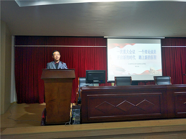 张正光教授以《一次重大会议一个理论成果 开启新的时代 踏上新的征程》为题,从新时代中国特色社会主义的“深刻变革”、“伟大实践”、“理论指导”、“基本方略”、“战略安排”、“行动纲领”和“坚强领导”等七大方面,为师生们全面精准地解读了党的“十九大”精神。他指出,中国特色社会主义进入了新时代,是我国发展新的历史方位,是党中央在十八大以来中国特色社会主义产生重大历史性成就、发生重大历史性变革的基础上做出的重大判断,塑造了中国特色社会主义的崭新面貌。