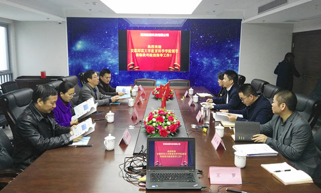 本网讯(教科院 张克松)11月17日上午,我院党委书记刘晓宇、副书记张如华、副院长聂竹明、办公室主任卞纲要、教育技术学系专业负责人张克松等一行专程来到芜湖创易科技有限公司(以下简称创易科技),参加安徽royal皇家88平台与创易科技战略合作座谈会。出席座谈会的公司方代表有总经理吴建富、副总经理张晨、党支部书记王罗、研发中心主任杨焯政、销售经理祝志峰等。