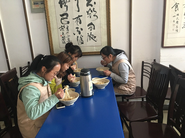 十点整,等候在雨花斋门外的老人们陆续进入就坐,学员们分成了递碗、收碗、洗碗以及杂务四个小组,大家相互协作,积极配合,为雨花斋的老人们尽心服务,而就餐的老人也连连向同学们表示感谢,场面十分温馨。紧张忙碌的工作之后,送走了前来就餐的老人,学员们也吃上了热腾腾的面条和包子。秉着雨花斋 “吃多少打多少”的原则,大家也着实完成了一次“光盘行动”。