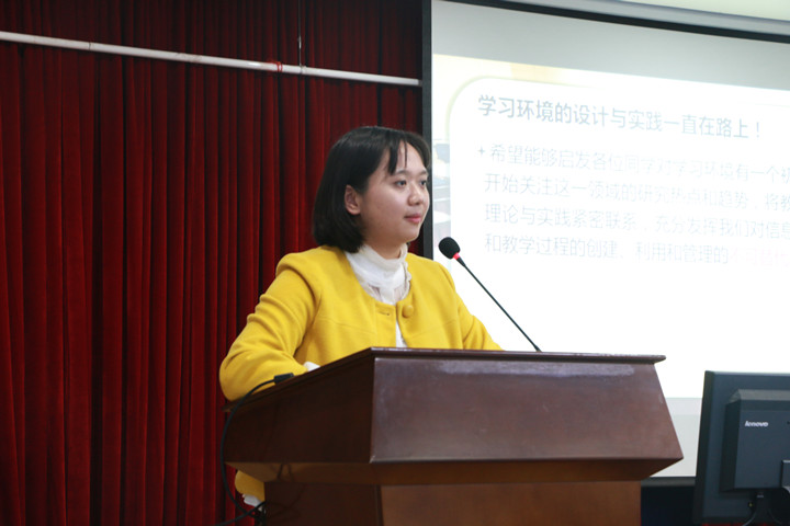 第二场是由许玮博士带来的题为《学习环境理论发展与应用实践》的学术报告。报告内容主要包括:第一,学习环境理论的学科定位、社会发展和教育信息化政策推动。第二,学习环境理论的热点趋势、理论基础和内涵界定。第三,当前物联网技术发展现状、教学现状需求及学习环境设计方面的项目延伸探索实践。许博士结合国内教育技术学科专业开设的课程、国外学者教育技术研究的成果、建构主义学习环境的隐喻、自身参与的环保主题教学活动设计实践及苏州市部分综合实践基地学校建设情况对学习环境理论发展的背景、理论和实践进行了深入浅出的阐释,并且希望所有同学关注学习环境领域的研究热点和趋势,将教育技术学的理论与实践紧密联系,充分发挥我们教育技术人对信息化教学资源和教学过程的创设、利用和管理的不可替代的作用。报告中,老师和同学们互动热烈,活跃了现场氛围,使整场讲座在轻松融洽的氛围中进行。