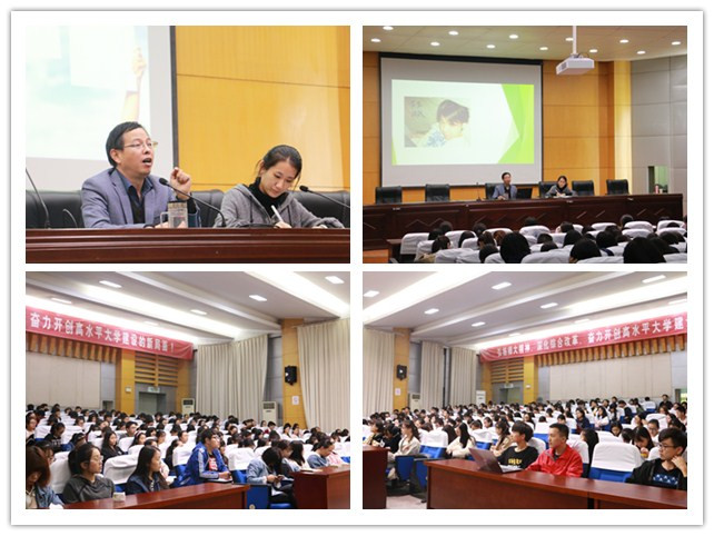 本网讯(教科院 谭茹轩 杨悦琦)为切实做好大一新生适应性教育和大学生思想政治教育工作,帮助新生提高思想认识,明确未来大学生活的前进方向,10月19日晚,院党委书记刘晓宇在田楼报告厅为2017级新生作专题讲座——“大学的味道”,讲座由17级新生辅导员谭茹轩老师主持。