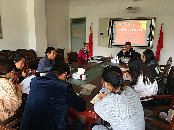 会上,党委副书记张如华书记首先传达了校党委组织部召开的党员发展工作会议精神,紧接着,结合《中共安徽师范大学委员会发展党员工作实施细则》和《安徽师范大学推荐优秀团员为入党积极分子人选工作的实施细则》,对照《安徽师范大学发展党员工作流程图》详细为支部书记梳理了发展党员工作的具体流程及具体细节。随后,各党支部书记还就日常党员教育培养工作中的突出问题进行了交流和讨论。