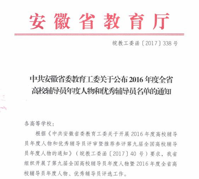 教科院龚伟老师荣获安徽省“2016年度高校辅导员年度人物”称号