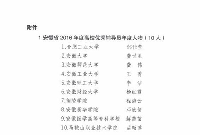 本网讯(教科院 张启山)日前,省委教育工委下发了《中共安徽省委教育工委关于公布2016年度全省高校辅导员年度人物和优秀辅导员的通知》,我院2014级专职辅导员龚伟老师被授予“2016年全省高校优秀辅导员荣誉称号。