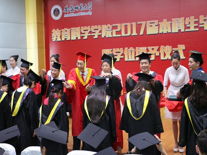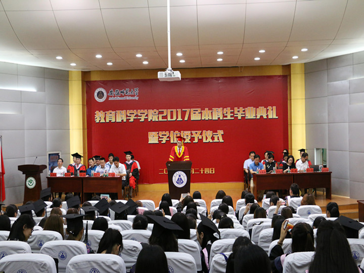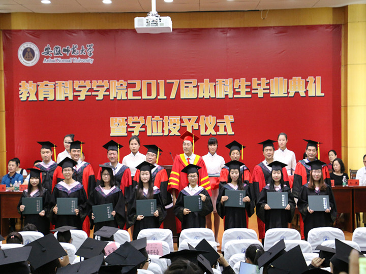 本网讯(教科院 马兴)为谁盛放花满路,教科心如故。纵使时间匆匆,也想为毕业生留下最美好的回忆。6月24日下午,教育科学学院2017届本科生毕业典礼暨学位授予仪式在田家炳教育书院报告厅隆重举行。校党委常委副校长毕明福、教科院实习基地代表、安徽省教师教育协同创新试实验区代表、院友代表、毕业生家长代表、学院党政领导、教授委员会全体成员、各专业负责人、学院教师、各科室秘书等共同为学院178名本科毕业生送别。典礼由学院党委书记刘晓宇主持。