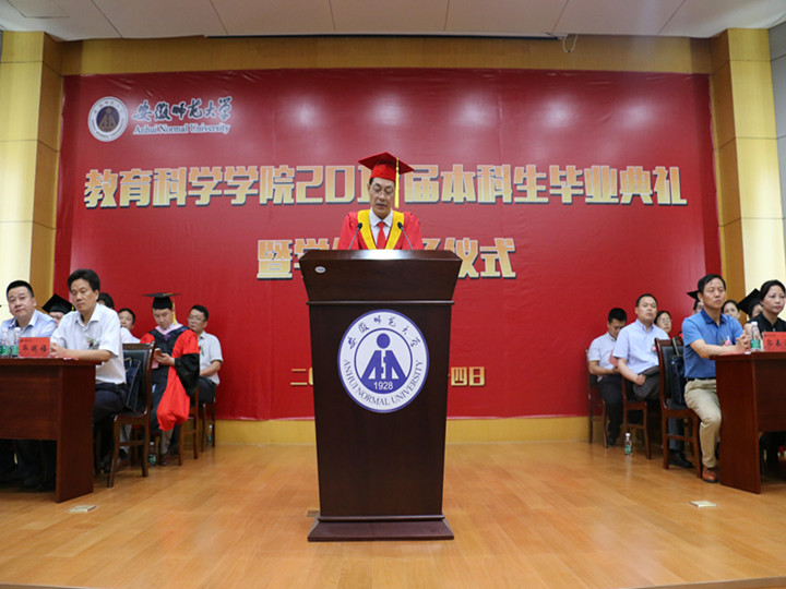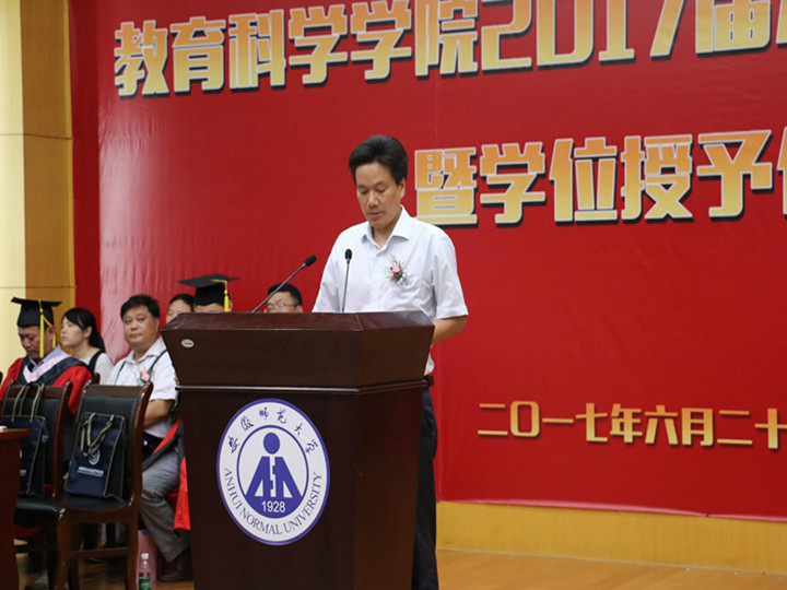 一场盛典,深深祝福只盼诸君前程似锦。“愿你们成为有温度、有高度、有力度的人,做到心中有大爱、眼里有乾坤、胸中有丘壑,脚踏实地,以只争朝夕的使命感、登高望远的责任感,永葆学习之心,勇担时代使命,尽显青春担当。”毕明福副校长的深深祝福与嘱托寄予了毕业生太多希望,他希望毕业生以大胆创新、勇攀高峰、主动引领的精神肩负起时代赋予的神圣使命,在激情奋斗中绽放青春光芒。院长桑青松满怀喜悦的祝贺学生顺利毕业,与同学们追忆了大学四年学院取得的成绩。他希望毕业生“告别过去超越自我”,将过去作为发展的基石,在更大的舞台上做最好的自己;他期待毕业生能够“立足当下成就自我”,在基层一线敢拼敢闯;他如父亲般叮嘱毕业生能够“拥抱未来善待自我”,要努力拼搏也要健康快乐。温情的话语让毕业生离情难舍,眷念无限。校友芜湖市广播电视台副台长韩万春希望毕业生能够永葆大气、正气、灵气、霸气,开创更美好的未来,为母校争光,为学院添彩。毕业生家长代表柏军在对学校学院表示感谢的同时也期待毕业生能够继续将教科院当成自己的家,继续好好努力,报效学院的精心培养。毕业生侯晓丽代表全体178名毕业生表达了对母校深深感恩留念之情。无限祝福感恩,将是我们一生奋斗的动力。