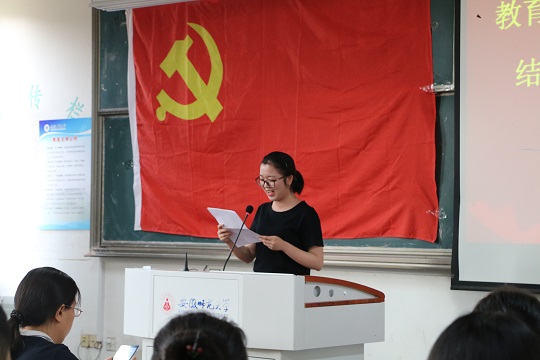 在同学们激昂的情绪中,本期发展的预备党员代表、2015级教育学本科生张皓南同学上台发言。她回顾了自己向党组织靠拢的历程,并表示,“预备党员是成长的新起点,是一个共产党人万里长征迈出的第一步,要谨记组织上入党是一生一次,思想上入党却是一生一世,使自己思想上做到入党,对照党员的标准找出自己的差距,严格要求自己,坚定信心,执着追求,争取更大的进步。”