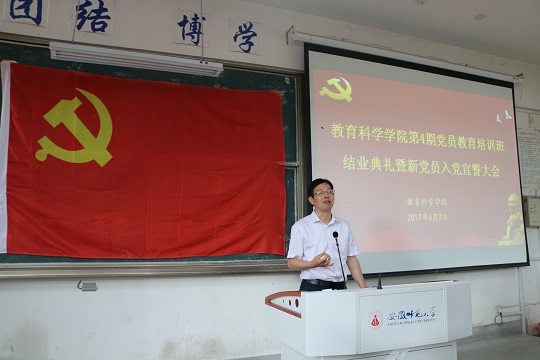 本网讯(文/教科院 裴扬 图/范晨晨)2017年6月7日下午,我院第4期学生党员培训班结业典礼暨新党员入党宣誓大会在田家炳教育书院8101教室举行。院党委书记刘晓宇、副书记张如华、党委秘书马兴、党课班副班主任随小莉以及党课班全体学员、本期发展的预备党员和转正的党员参加了会议。会议由党课班班主任莫大贡主持。