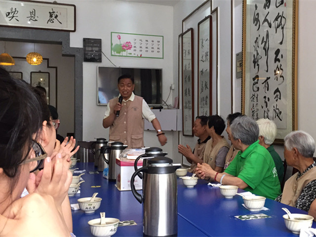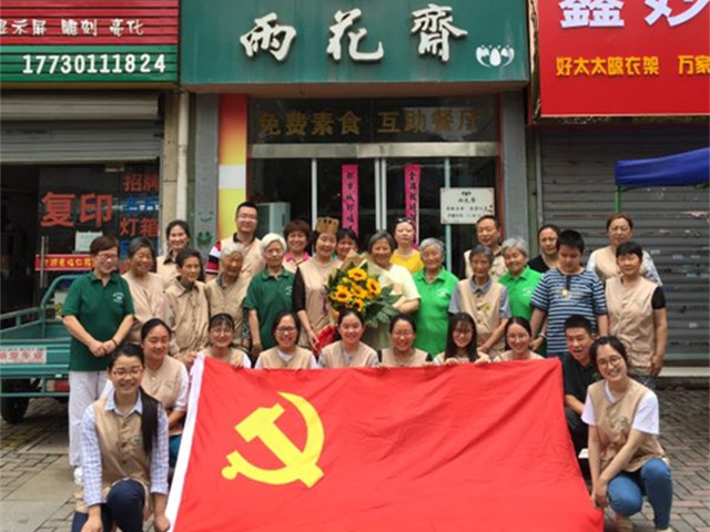 志愿服务后,雨花斋的志愿者们开始素食,恰逢一位雨花斋志愿者谢阿姨的生日,她热泪盈眶地说这是自己六十四年来第一次过生日,能和这么友爱的大家庭在一起,她感到非常幸福。与此同时雨花斋义工们分享了在雨花斋志愿服务多年的经历,大家欢歌笑语,其乐融融。