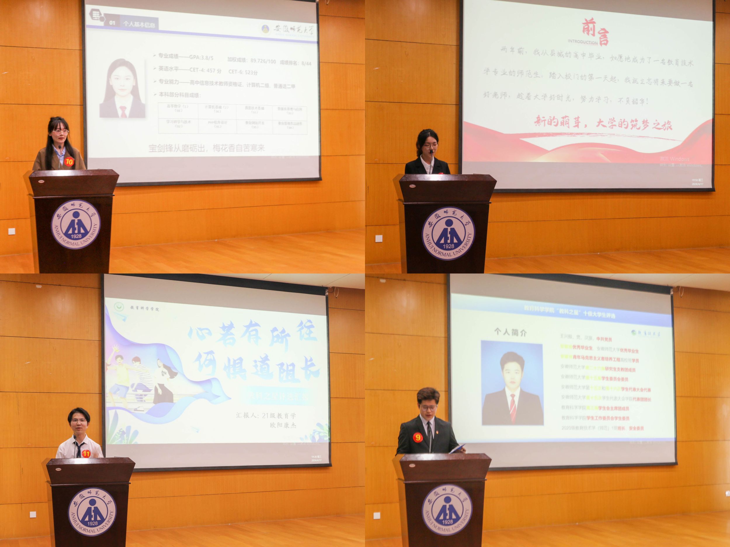 为落实大学生护航行动计划,发挥青年先进典型模范引领作用,树立自强、勤奋、进取、创新的榜样,引领教科学子争做时代青年。4月17日晚,教育科学学院于赭山校区田楼报告厅举办第三届“教科之星”十佳大学生评选汇报会。院党委副书记杜凤、小学教育全科型专业负责人王芳、教育学专业负责人徐赟、小学教育复合型专业负责人杨俊铨、院团委书记付银行、各年级辅导员出席活动并担任评委,各年级学生代表现场观摩。