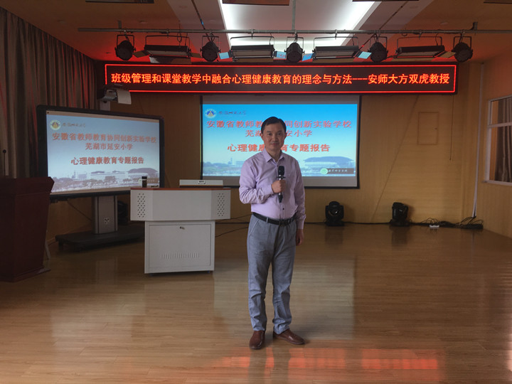 本网讯(教科院 孟庆娟)616日下午,我院方双虎教授应安徽省教师教育协同创新中心实验学校芜湖市延安小学的邀请,给延安小学全体教师做了《班级管理和课堂教学中融合心理健康教育的理念与方法》的专题报告,报告会由延安小学刁玉梅校长主持。