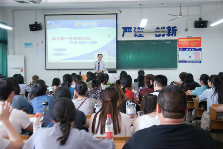 本网讯(教科院 文/马金凤 图/胡旭珽)为加强学前教育专业学术交流、推动专业发展,我院邀请福建师范大学教育学院丁海东教授,于5月18日下午,在田家炳楼8303教室,进行题为“幼儿园户外游戏课程的趋势与实践探索”学术报告。朱立新副教授担任本次活动主持人,参与报告的人员有滁州市园长国培班教师、安徽师范大学附属幼儿园教师和我院15、16级学前教育专业研究生。