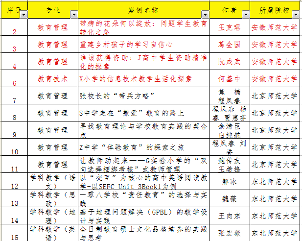 (研究生办公室)近日,全国教育专业学位研究生教育指导委员会(以下简称"教指委“)组织专家评审,我院阮成武教授撰写的《谁该获得资助:J高中学生资助精准化的探索》、葛金国老师撰写的《重建乡村孩子的学习自信心》、马家安老师指导的教育硕士王克瑶撰写的《带病的花朵何以绽放:问题学生教育转化之路》案例通过初审,王清老师指导教育硕士何基中撰写的《X小学的信息技术教学生活化探索》直接入选案例库。这些案例都是去年入选的全校首届教育专业学位优秀案例,经安徽省教育专业学位案例库和案例教学推广中心组织专家精心修改打磨的基础上推荐参评的。