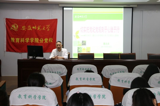 本网讯(教科院 裴扬 范晨晨)为了引导学生党员更好地学习党纪党规,做一名合格的党员,2017年4月16日晚上,我院分党校邀请校纪委副书记、监察处处长陈文兵老师为我院党员教育培训班的学员们作了《切实把党纪党规刻于心践于行》的专题讲座。培训班非毕业班同学参加了这次讲座,讲座由培训班16级辅导副班主任随小莉老师主持。