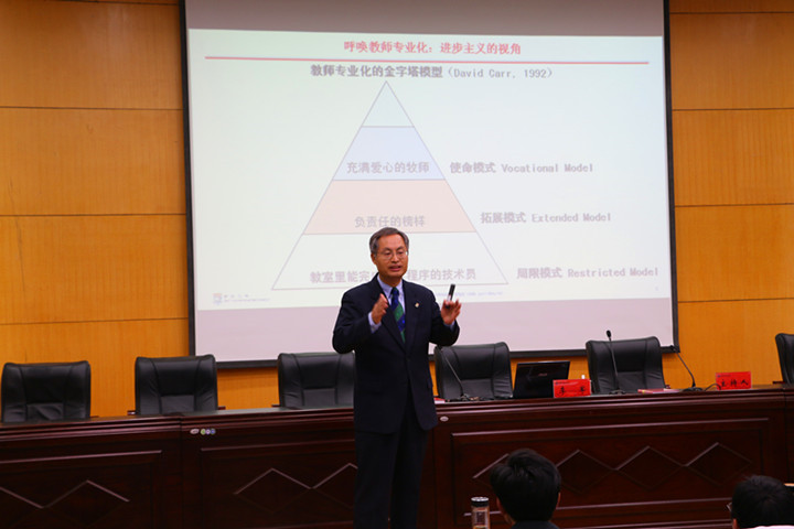 随后,李博士与大家分享了自己求学发展的经历以及近十年研究新出版的著作,从论文选题、到知识信仰、再到开展教师教育政策的学术研究,并用“路漫漫其修远兮,吾愿上下而求索”鼓励师生学无止境、不断前行。紧接着,李博士向大家演绎教师专业化的金字塔模型,中国教师教育发展的三重拼图,以及教育带来的全球化挑战。他指出,“要从批判和理性的视角达成一种理性共识:通过教师教育等一系列政策,提高国家成就和可竞争力”。最后,李博士通过生动的案例分析,向大家诠释教师教育政策研究多维视角的重要性,并且主张中国教师教育的发展应该基于多学科、多维视角、批判的眼光、树立终身学习的价值观。李军博士本次报告旨在指出:教师教育的中国模式应当建构在中国特色与传统——儒家认识论基础之上,养成布道士式的教师;中国追求培养世界一流教师的发展经验对全球化大潮中的教师教育改革具有深远的本土以及国际借鉴意义。