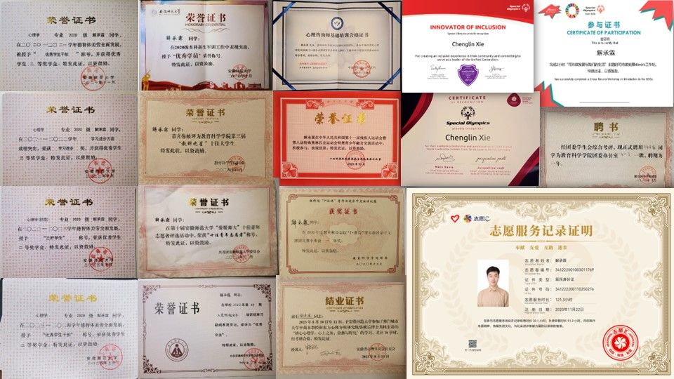 心理学是他的兴趣所在,大学四年期间,他一直不断精进自身专业素养,四年综合素质成绩位于班级前10%,连续四年获得校奖学金,参加中科院心理所的心理咨询师培训。无论在学习上还是生活上,解承霖同学都严格要求自己,锐意追求进步,积极向党组织靠拢,是党校培训班中的“优秀学员”,获评2024“教科之星”十佳大学生。
