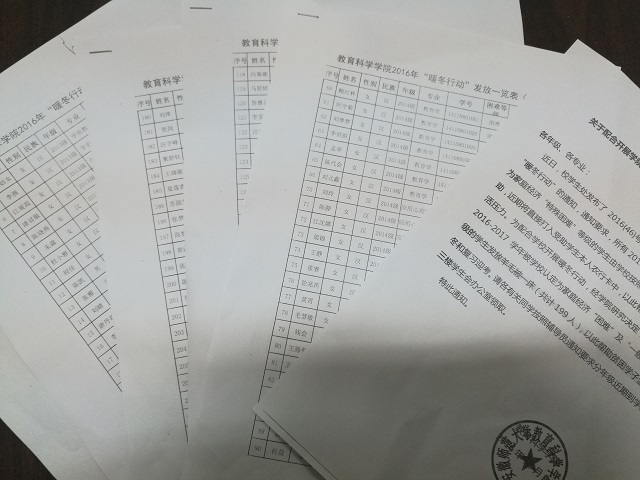 暖学暖冬,创新资助方式。本学期以来,学院将“暖学”与“暖冬”工作作为学生资助工作的重中之重来抓。通过辅导员例会的部署、各年级前期摸底,精准、快捷的缓解家庭贫困学生的生活问题。2016级小学教育是我院今新招的定向招生的专业,学生主要来源于贫困地区和农村家庭。“暖学”行动在保障公平的前提下,重点倾斜此类贫困学生。“暖冬”行动继承了我院实物发放的传统,统一采购优质品牌暖绒冬被,全员覆盖,在寒冷的冬季为贫困生送去贴心的温暖。
