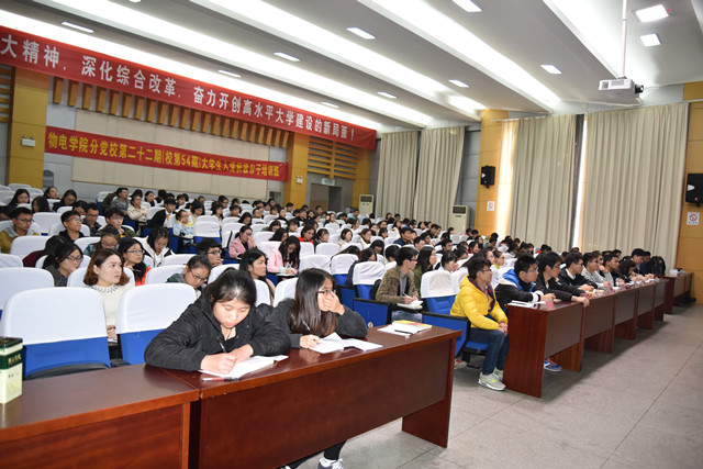 本网讯 (教科院 曹玲玲) 为使学员们深入了解党的十八届六中全会精神,端正思想态度,树立坚定理想信念,11月12日下午,我院与物电学院党校班邀请政治学院张正光教授为学员们讲授关于“在新形势下加强和规范党的政治生活的根本遵循——学习贯彻党的十八届六中全会精神”的讲座。我院党校班班主任莫大贡老师、物电学院党校班班主任李亚老师及200余名学员参加了讲座。讲座由李亚主持。