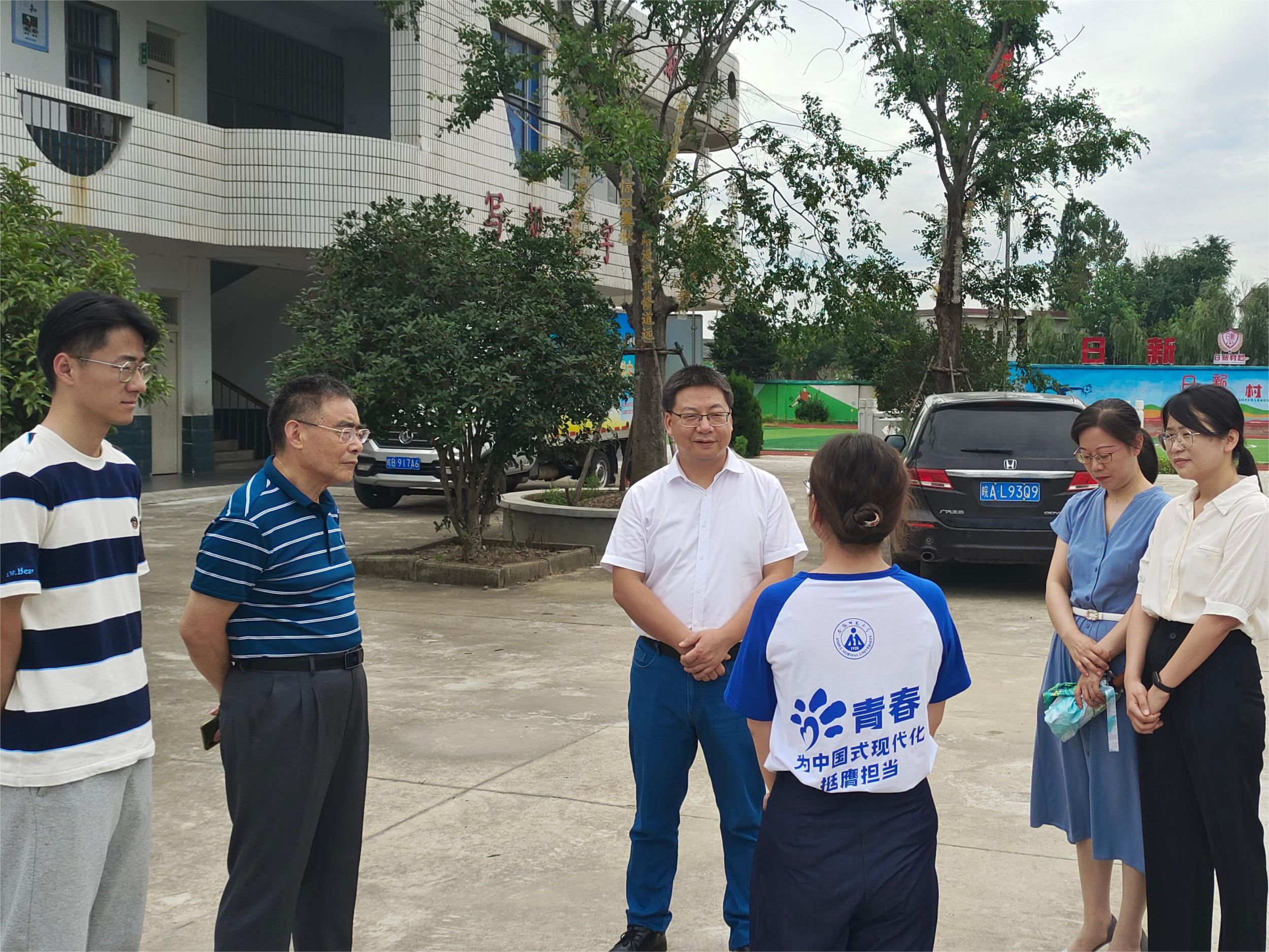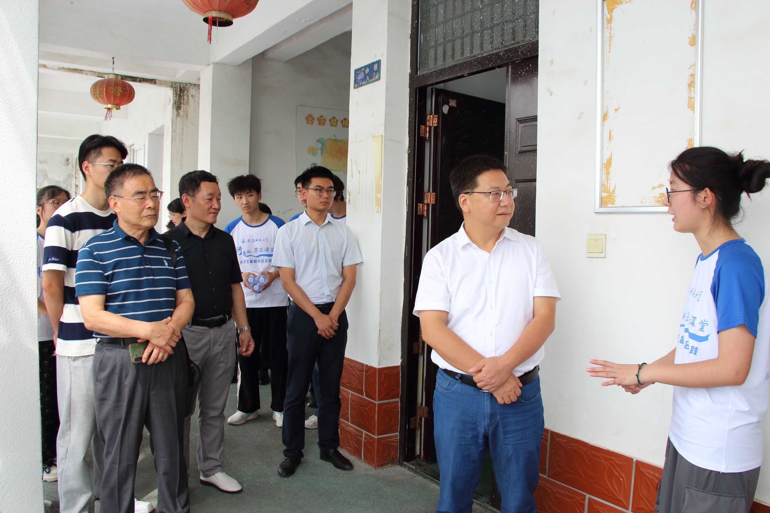 许国飞一行跟随同学们参观了新河小学、夹河小学,关心各支教点目前的实践进展、食宿安排等方面情况,来到队员们的办公场地和住宿场所,详细询问了团队成员的生活情况。许国飞与学生亲切交流教学和教育调研过程中出现的问题,对队员们的支教热情和奉献精神给予鼓励,对实践过程中的安全保障工作做了重点提醒。